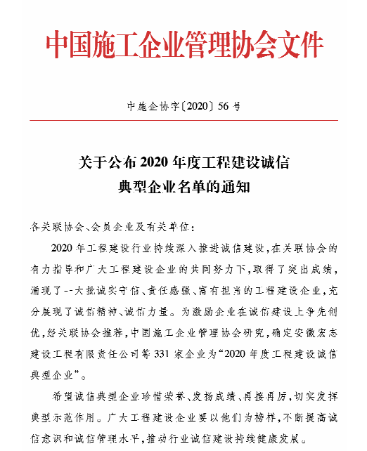 ? ? ? 2020年工程建設行業持續深入推進誠信建設,廣泛開展行業信用評價工作。近日,中國施工管理協會公布了“2020年度第一批工程建設企業信用評價”和“2020年度工程建設誠信典型企業”名單,漢陽市政多個公司獲評榮譽。
