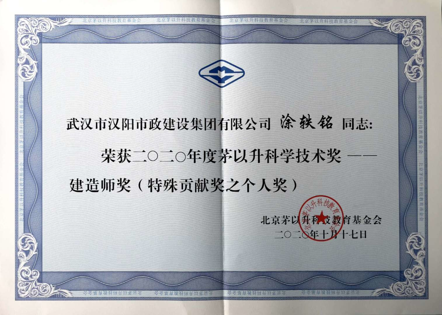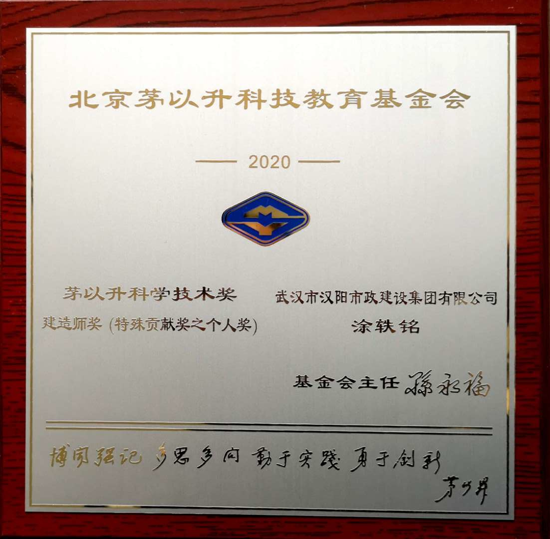 10月24日,由中國工程院、中國鐵道學會、中國土木工程學會、北京茅以升科技教育基金會聯合主辦的“北京茅以升科技教育基金會第29屆頒獎大會暨第十屆橋梁與隧道工程技術論壇”在北京舉行。大會對抗擊疫情中為武漢“兩山”醫院建設做出突出貢獻的企業和個人予以表彰,漢陽市政六公司總經理涂軼銘榮獲“茅以升科學技術獎——建造師獎(特殊貢獻獎之個人獎)”。