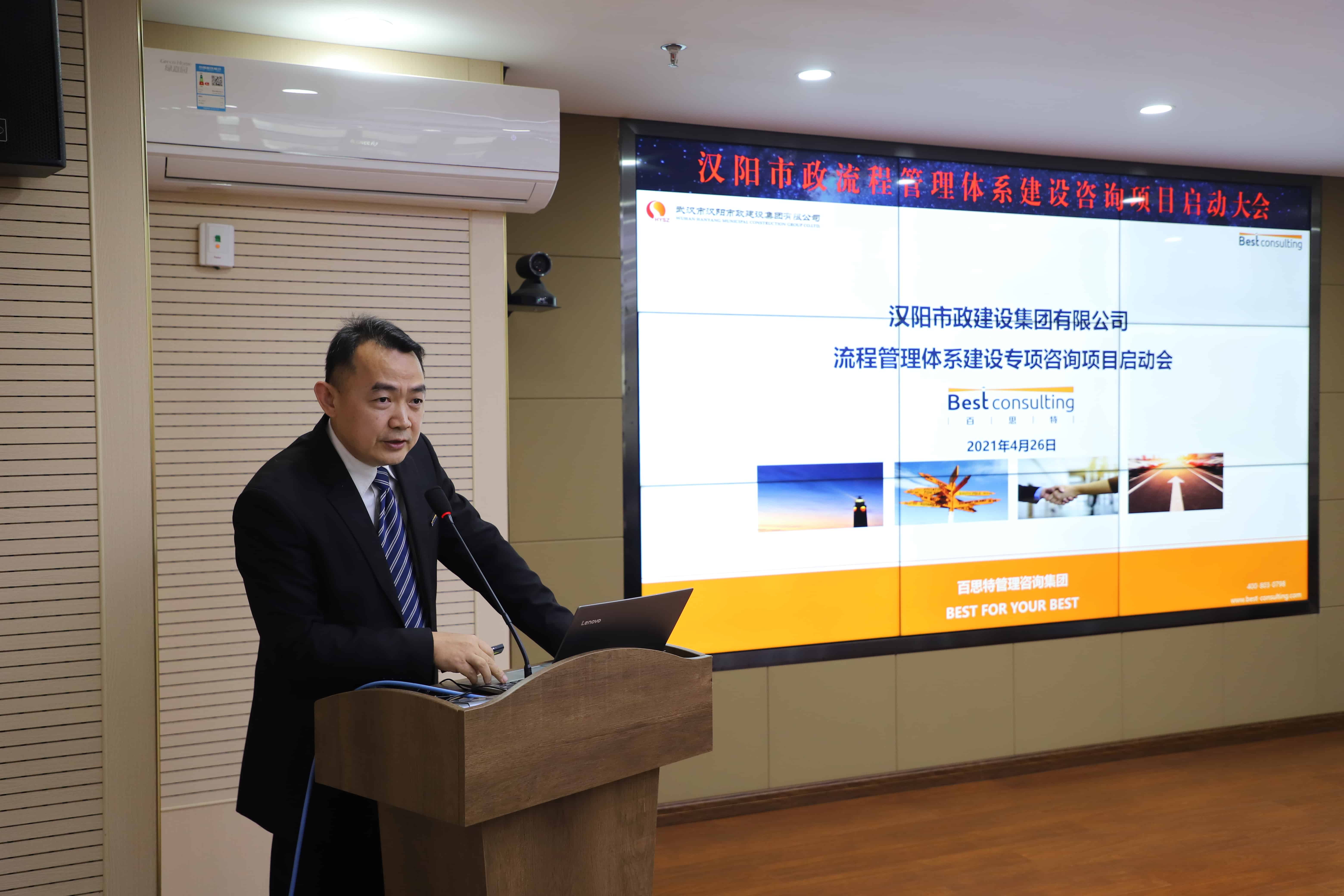 4月26日下午,漢陽市政流程管理體系建設(shè)咨詢項目啟動大會順利召開。漢陽市政黨委書記、董事長嚴悌文等黨委班子成員,各分子公司、機關(guān)各部門負責(zé)人,以及百思特管理咨詢有限公司常務(wù)副總裁、變革研究院執(zhí)行院長孟德強等項目顧問團隊參加了會議。會議由集團公司總經(jīng)理助理冷雪主持。