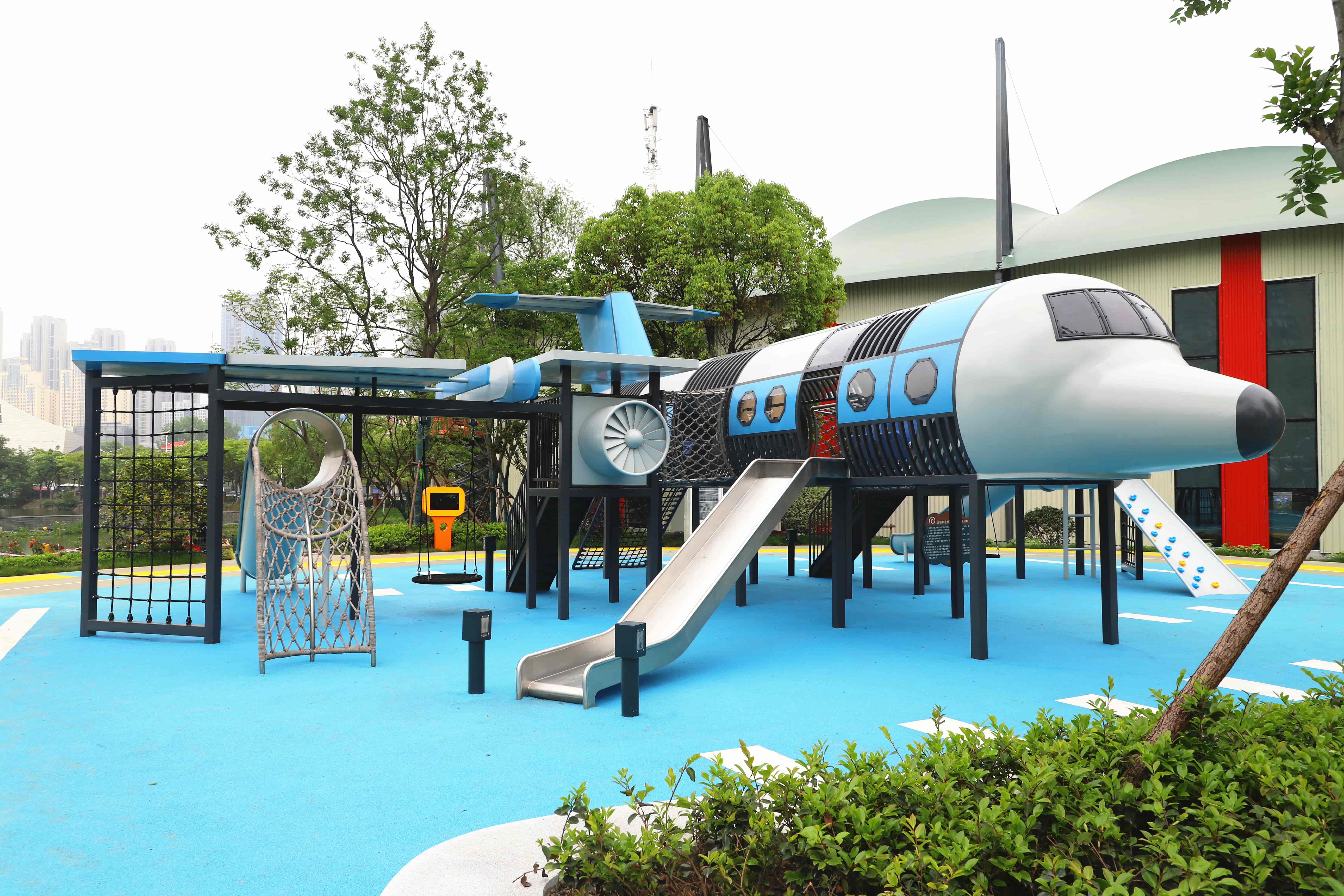 在公園的中間地帶,是兒童和青少年活動區(qū)。這里有直升機、運輸機等形狀的游樂設(shè)施,還有各色的卡通動畫秋千及座椅,既融入了軍事元素體現(xiàn)張之洞文化,又富有童心,展現(xiàn)了青春與活力。