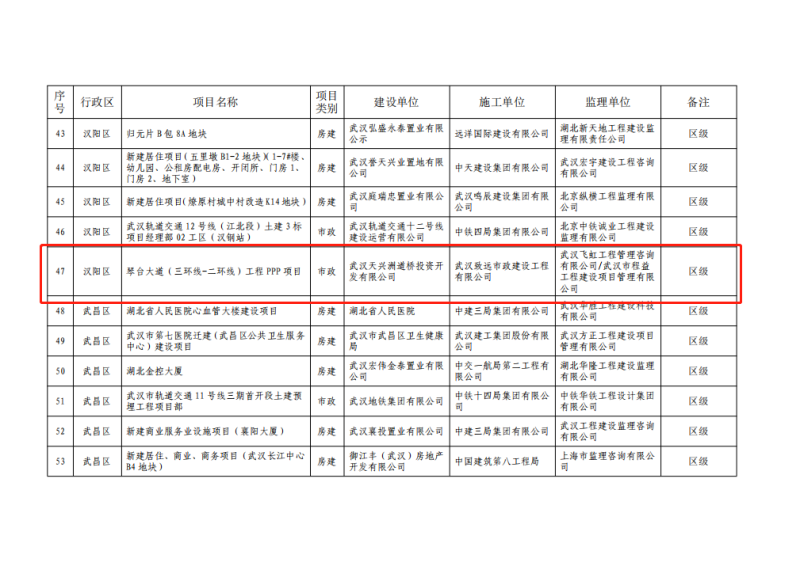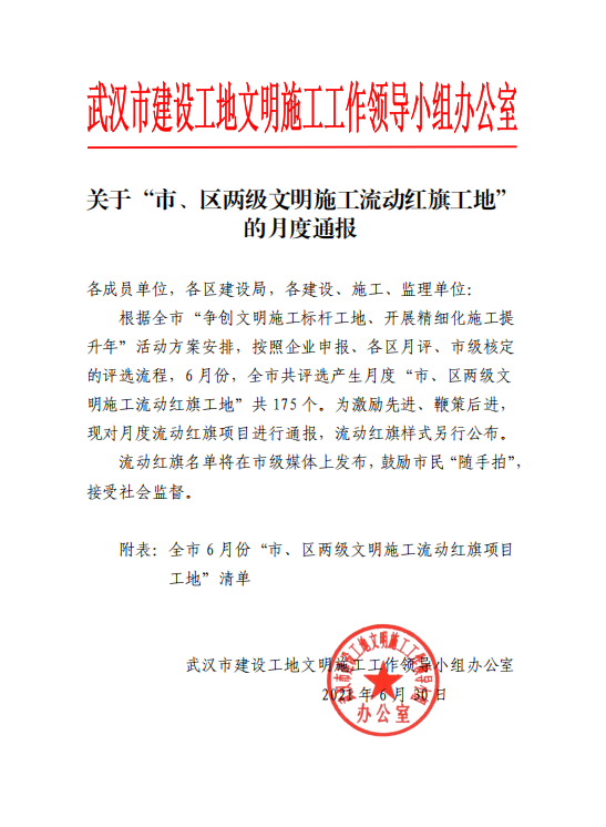 近日,武漢市建設工地文明施工工作領導小組辦公室發布了6月份關于“市、區兩級文明施工流動紅旗工地”的月度通報,漢陽市政及分子公司的8個項目獲評“流動紅旗工地”。