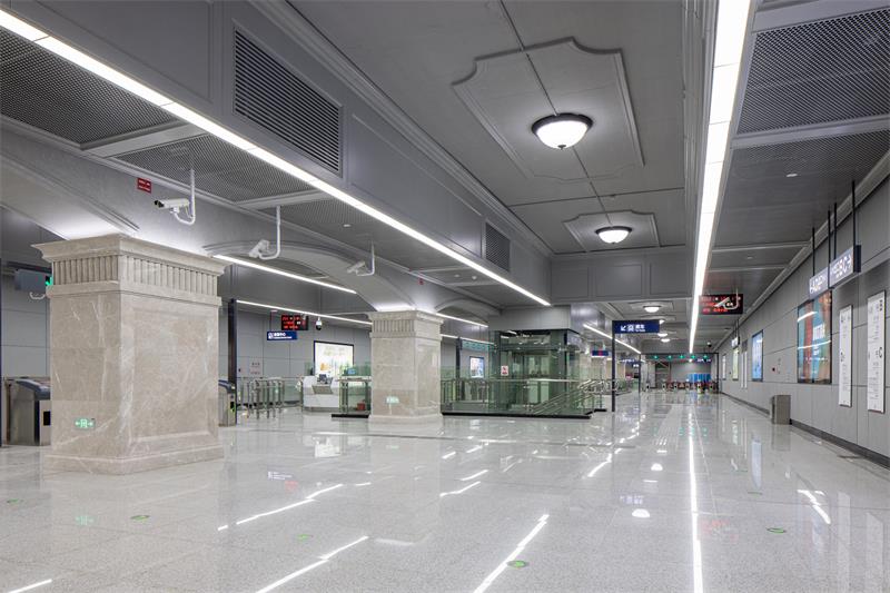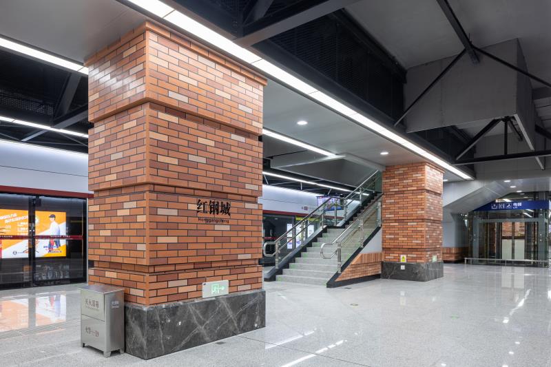 紅鋼城站以“紅城歲月”為主題,從紅鋼城的原始風貌入手,車站立柱提取“紅房子”紅磚元素,采用仿紅磚質感的高強纖維板進行仿制,墻面還原老建筑形態,上下采用紅色仿制磚,中間區域采用灰色的高強纖維水泥板,以打造懷舊的老武漢歲月感。車站照明燈具設計結合了極富工業元素的工礦燈,旨在將地鐵空間融入周邊環境,凸顯老武漢的街景特色。