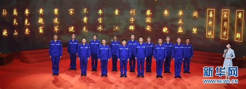 中船重工第七六〇研究所抗災(zāi)搶險(xiǎn)英雄群體中的14位同志(另外3位同志犧牲)參加發(fā)布儀式(9月11日攝)。新華社記者 李賀攝