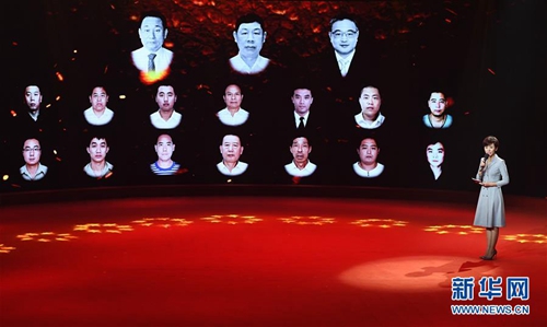 在主持人(右一)的引導(dǎo)下,中船重工第七六〇研究所抗災(zāi)搶險(xiǎn)英雄群體中的14位同志(另外3位同志犧牲)參加發(fā)布儀式(9月11日攝)。新華社記者 李賀攝