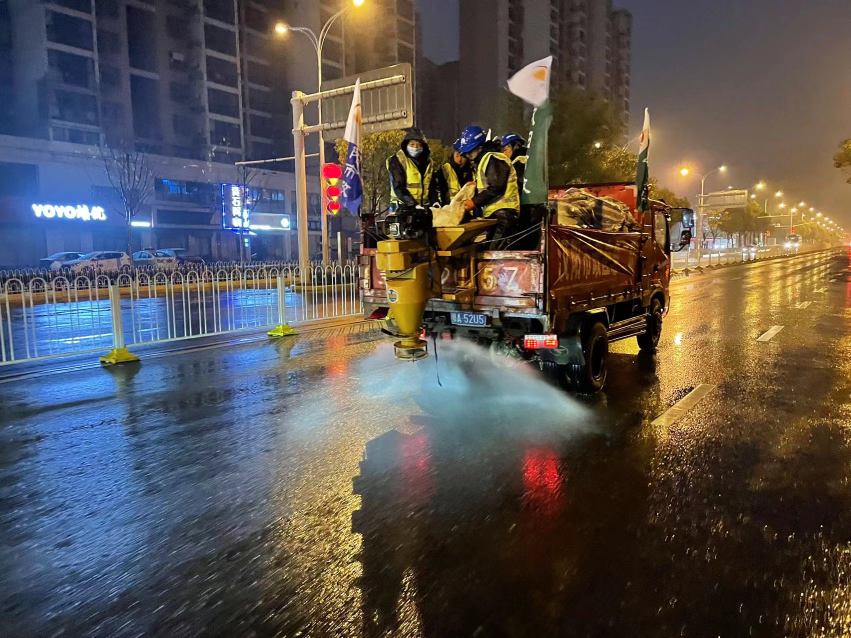 ? ? 瑞雪慶春,銀裝素裹,皚皚白雪雖然美麗,但也給出行帶來了不便。為確保市民出行安全,2月7日凌晨2點,漢陽市政志愿者服務隊、黨員突擊隊、清雪除冰應急隊緊急出動,在漢陽區墨水湖北路、漢陽大道等主干道進行撒鹽融雪除冰。截止2月7日上午11時,已經出動人員220余人,撒鹽車輛40余臺,融雪用鹽近百噸,確保漢陽區主干道無結冰。