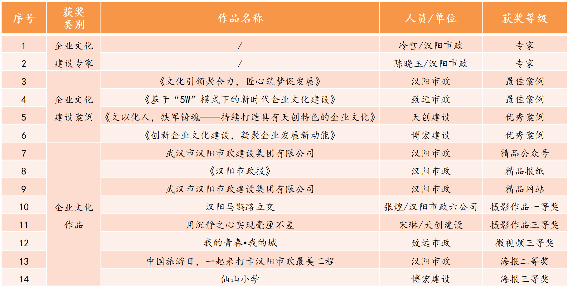 漢陽市政黨委副書記、紀委書記冷雪,團委副書記陳曉玉二人獲評“工程建設企業文化建設專家”榮譽稱號。4項案例獲評“工程建設企業文化建設最佳案例和優秀案例”。工程建設企業文化作品競賽方面,漢陽市政在公眾號、報紙、網站、攝影、微視頻、海報六大競賽項目中斬獲8項榮譽。