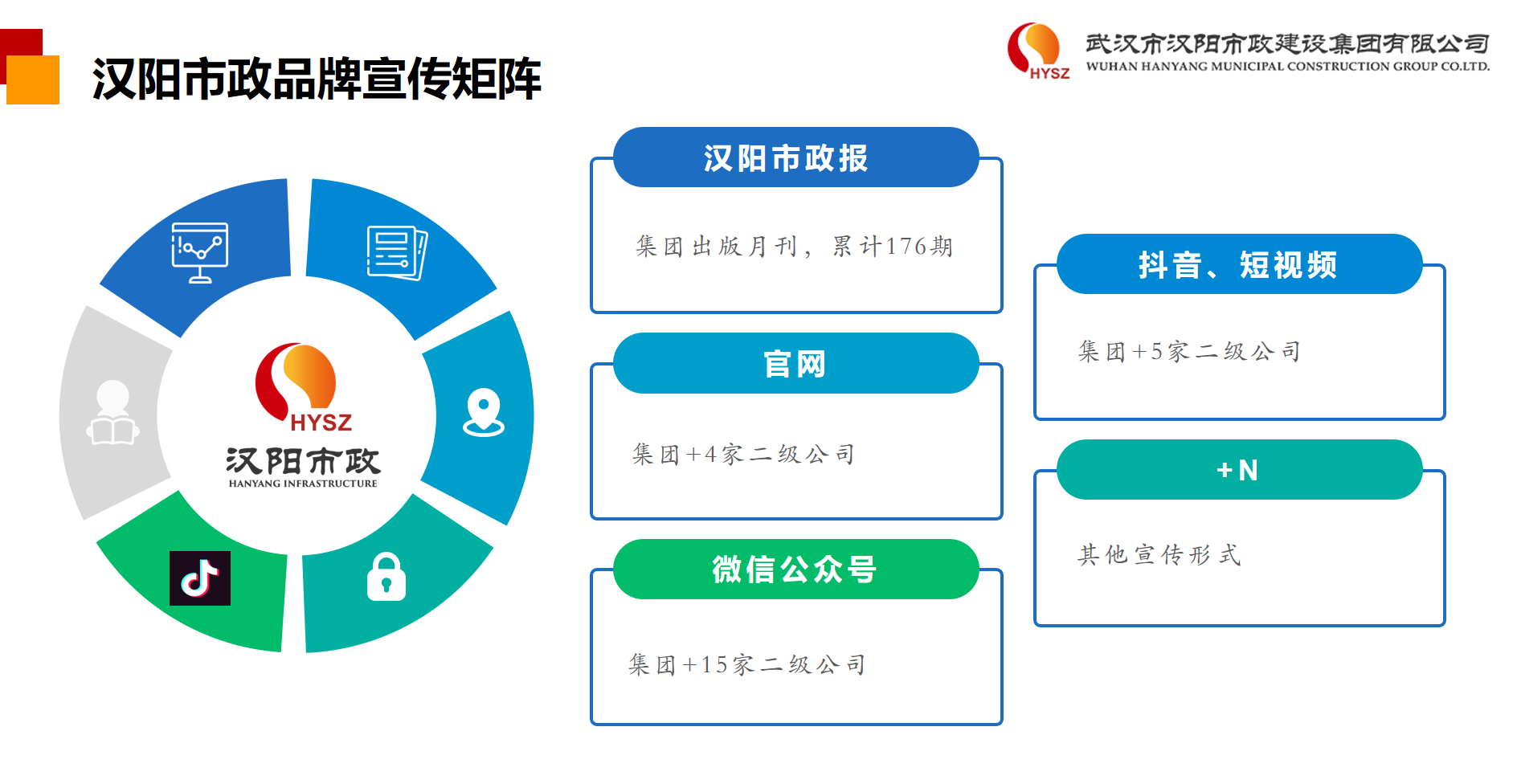 長期以來,公司品牌文化建設工作推陳出新,漢陽市政報、官方網站、微信公眾號、抖音企業號、微信視頻號“5+N”傳播矩陣持續夯實,現已形成“1+15”的微信矩陣,“1+4”網站矩陣和“1+5”的抖音矩陣。集團《漢陽市政報》連續四年獲評中施企協精品報刊;集團微信公眾號獲評中施企協精品公眾號、全國建筑業優秀微信公眾號、湖北省建筑行業優秀公眾號、湖北十佳政務新媒體(城建);集團官方網站獲評中施企協精品網站,訪問量持續增長,品牌傳播力度不斷加強。