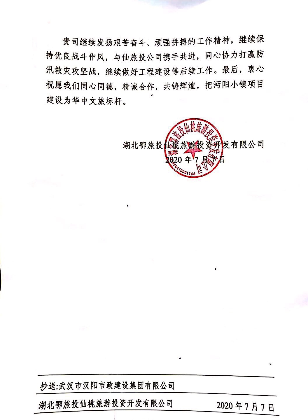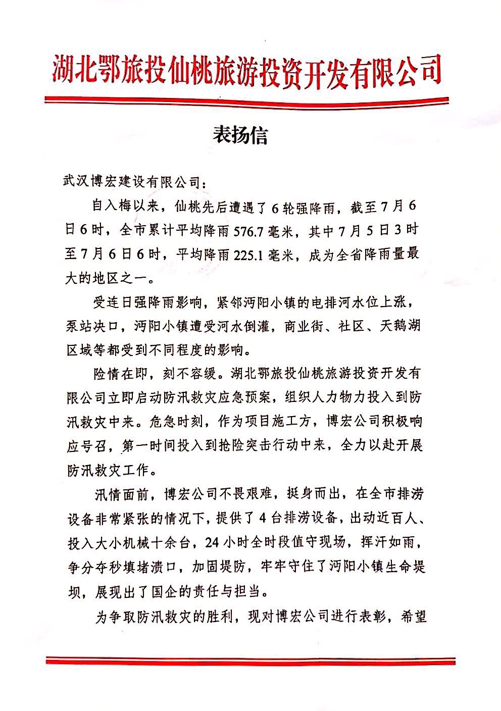 ? ? ? 2020年7月7日,鄂旅投仙桃公司給博宏建設送來表揚信,感謝博宏公司在汛情面前,不畏艱險挺身而出,為沔陽小鎮筑起生命之堤。