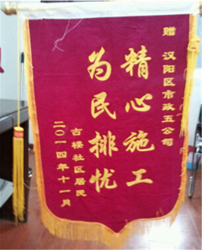 今年,五公司負責2014年老舊社區道路維修工程。該工程包括古樓社區、水仙里社區、墨北社區等多個社區,迄今為止已完成步磚面積約為1000㎡,工程質量受到社區居民和建設單位的好評。12月1日,古樓社區居民代表,將一面“精心施工、為民排憂”的錦旗贈與了五公司,感謝五公司工程部為古樓社區作出的貢獻。