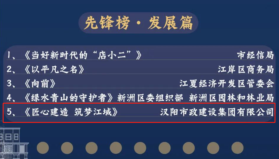 本次大賽共有565部作品參賽,經(jīng)專家評(píng)審會(huì)三次雙月賽和年度賽評(píng)選,將制作水平較高,生動(dòng)反映武漢市黨建引領(lǐng)基層治理創(chuàng)新實(shí)踐成果的30部作品,評(píng)為年度先鋒作品。漢陽市政黨委選送的作品《匠心建造 筑夢(mèng)江城》榮列其中,該作品由博宏公司具體負(fù)責(zé)策劃攝制。