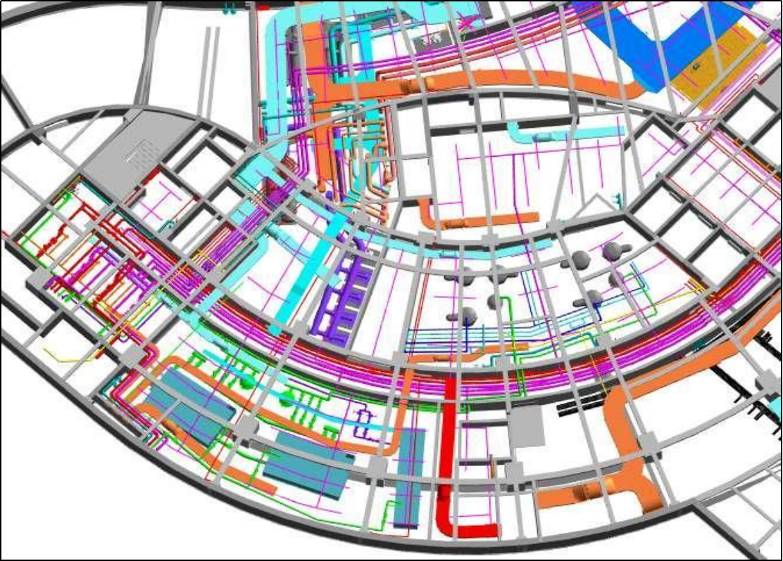 本工程利用BIM技術指導施工,為使地下室弧形區域的管道施工美觀整潔,BIM排布時采用了弧形成排管道,管線采用頂彎技術,在管道工廠進行集約化加工,實現了管線的精確定位,安裝效果美觀。