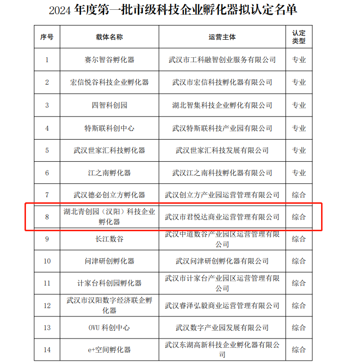 近日,武漢市科技創新局公示了《2024年度第一批市級科技企業孵化器認定和眾創空間備案名單》,武漢市君悅達商業運營有限公司運營的湖北青創園(漢陽)科技企業孵化器榜上有名,這不僅是園區發展歷程中的重要里程碑,更是對武漢市君悅達商業運營有限公司專業運營實力的最佳注解。